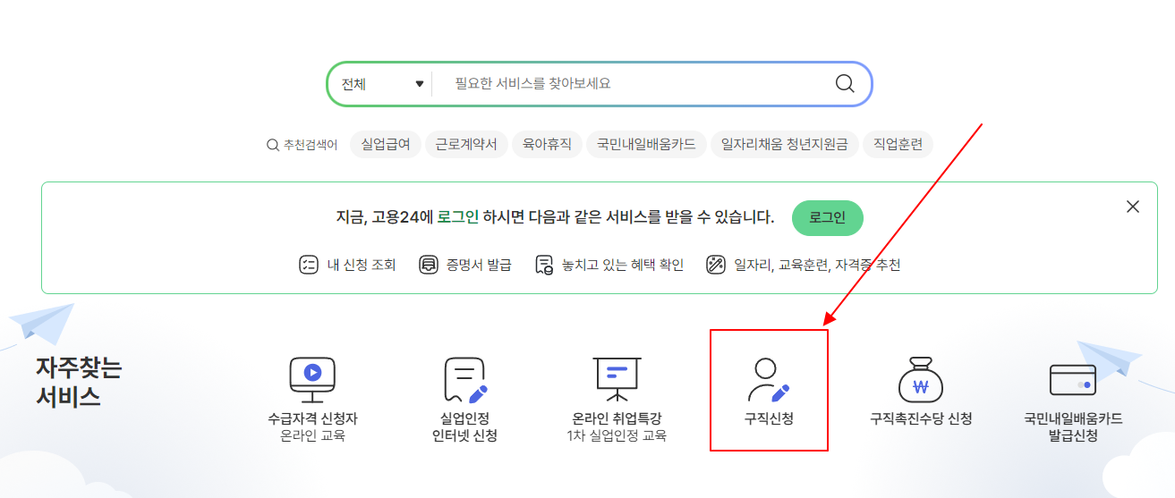 접속을 하면 아래 구직 신청이 자주찾는 서비스에 있습니다. 링크를 따라 들어가서 신청 후 다시 돌아와 주세요.