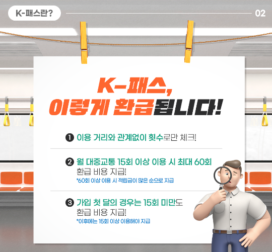 K패스 이용자가 출시 3개월 만에 이용자 200만명을 돌파했다고 밝혔습니다. 교통비와 탄소는 절감되고 대중교통을 활성화 하면서 자가용 대신 대중교통을 이용하시는 분들이 많이 늘어난 결과 입니다. 국토부는 이러한 관심과 이용을 더욱 촉진하기 위해 K패스 환급 인증 이벤트를 8월 8일부터 14일간 진행한다고 하니 꼭 신청하시고 혜택을 받아가세요!